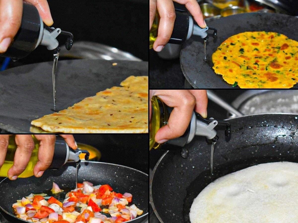 A unique cap that has two features- bottle dispenser and oil sprayer, this dispenser knows how much oil you want to take out and helps you do the same