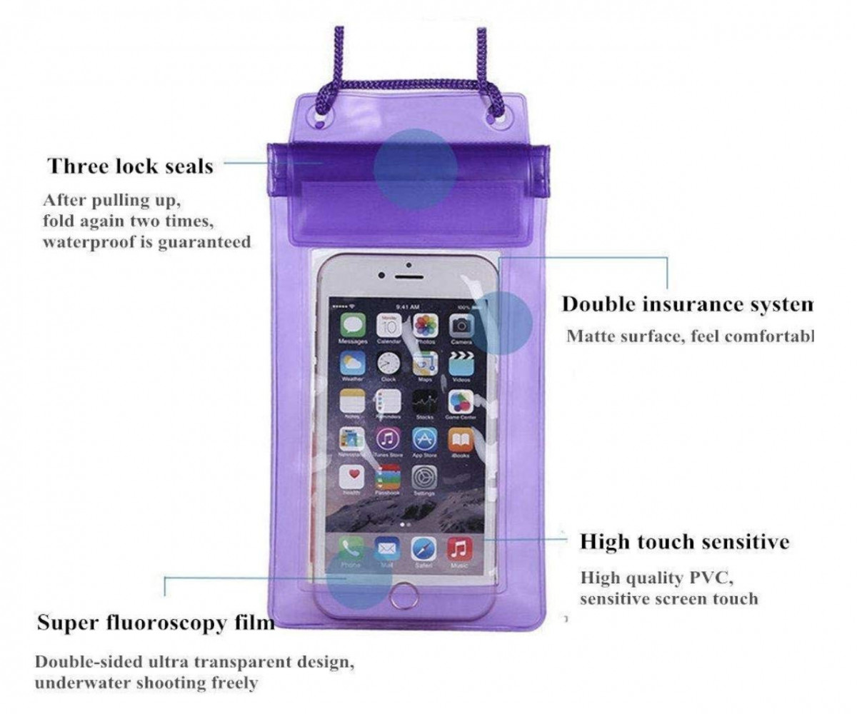 Waterproof Cover Universal Underwater Bag Transparent Touchscreen Mobile Phone Pouch This is cellphone waterproof bag, which material is PVC. It is easily to use and carry conveniently. You can use it when you go angling, swimming, dive, drift, or other places with water. The bag is waterproof, which can prevent your phone or other things from wetting when you are under water.