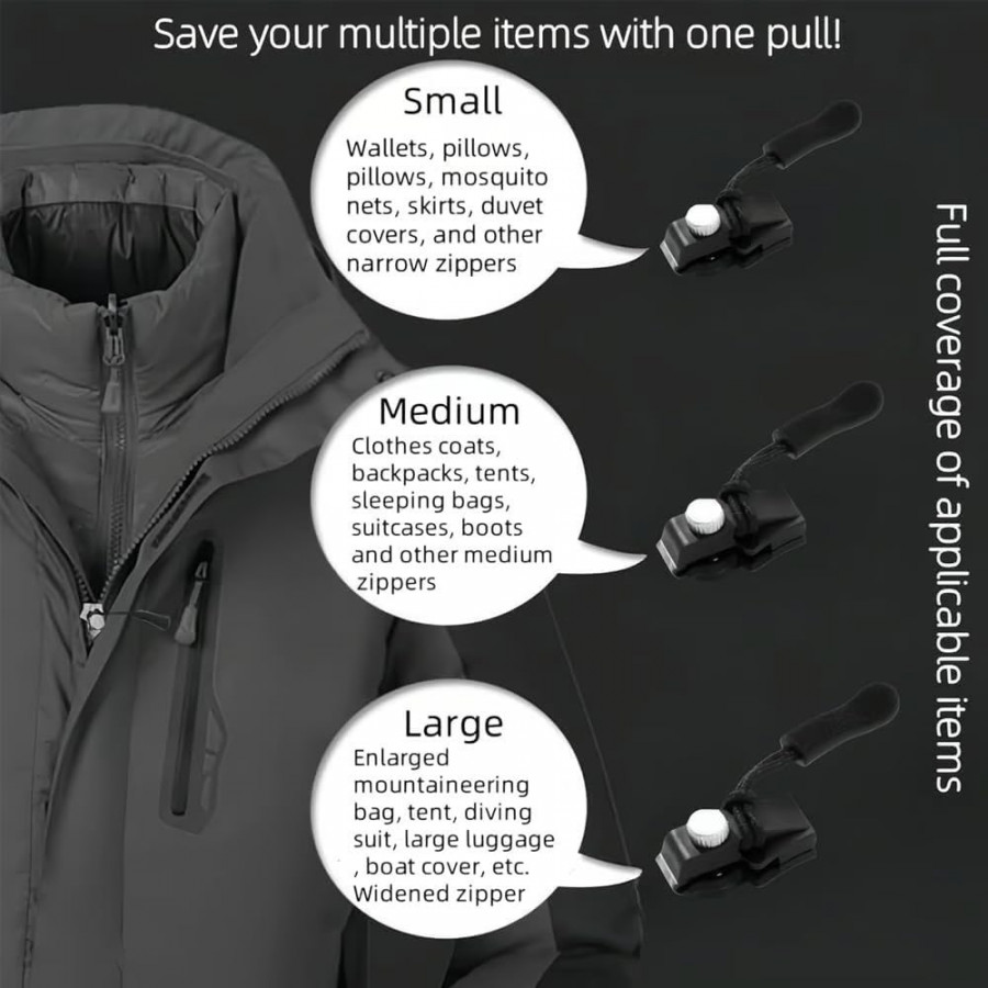 A quick and easy fix for any zipper. Fix jackets, jeans, pants, boots, sports and duffel bags, purses, wallets and more. It opens and then closes on any existing zipper track. This allows for repairs on worn or broken sliders on plastic teeth and nylon coil style zippers.